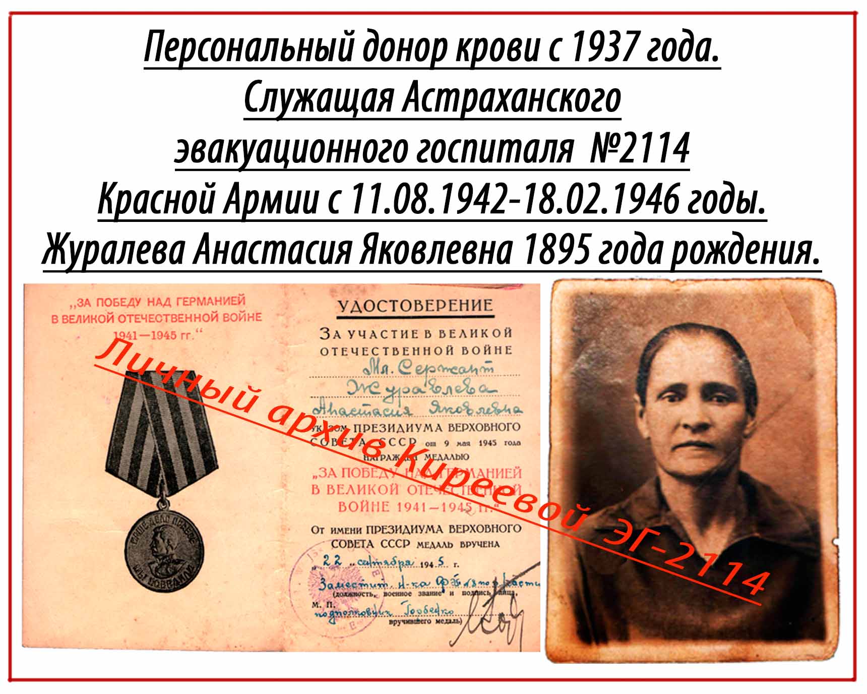 Мама ходила искать бабулину пенсию, правду в военкомат, в НКВД, КГБ. Искала причину забвения фронтового донора крови собственной матери Журавлёвой Анастасии Яковлевны и потерянный Орден Красной Звезды. Хотя, после войны юбилейными наградами ВОВ их регулярно награждали. Мама, не покладая рук и сил, много работала без выходных и отпусков, никогда не пользовалась ни путевками для лечения на курортах. Имея маленькую зарплату, сама имела серьезные проблемы со здоровьем, полученные на фронте, служа в эвакогоспитале №2114. Пенсию своей матери она так и не нашла.