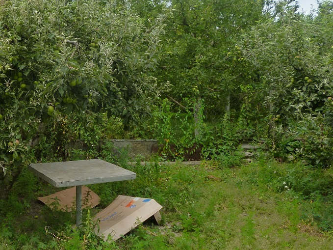 А вот стол снова поставлю в живописном уголке, как этот, ибо здесь широкая крона защищает от солнца. Хотя на солнце бывать вредно. Но на закате от лучей прикрывает. Уголок кажется слегка запущенным, как на картине В.Поленова "Пруд", почему-то вспомнилась, но за садом нужен тщательный уход.