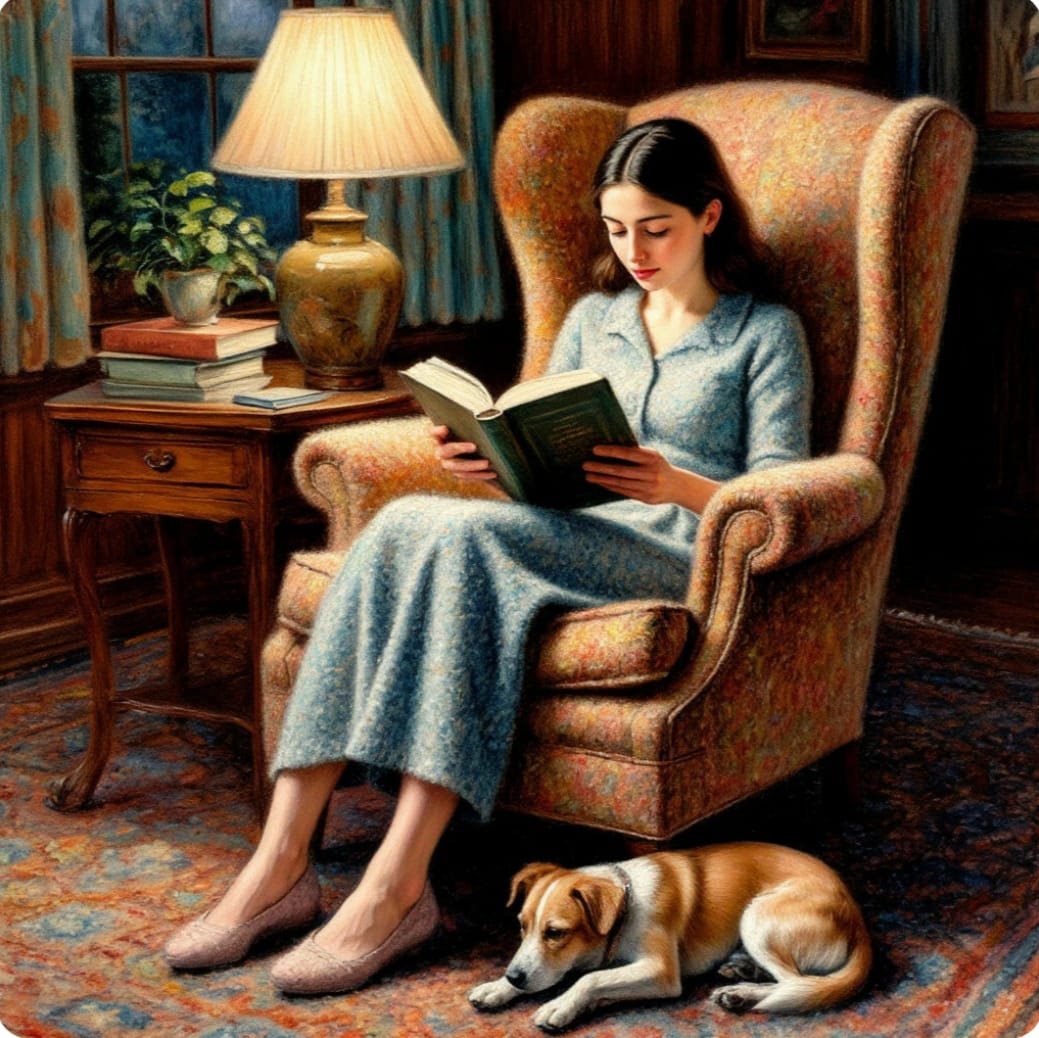 Она моет посуду, принимает душ, заглядывает к маме, тихонько целует, поправляет одеяло. Включает уютный торшер и усаживается с книгой в мягкое кресло. Маленький бумажный кораблик уносит её в другую страну, где можно прогуляться по живописным деревенским улочкам и городским площадям Испании. Перед сном она выйдет на лоджию, посмотрит на ночное небо, на светящиеся окна, пожелает городу доброй ночи. Засыпая, спустит с кровати руку, проверит, тут ли собака, почешет за ухом ...