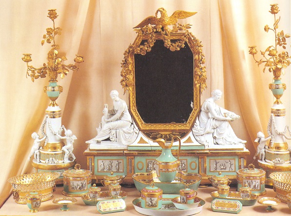 Замечательным произведением Императорского фарфорового завода является «Зеленый туалетный прибор», в настоящее время представленный в Жилых комнатах Марии Федоровны. Изготовление его было начато в 1800 году, а закончено в 1803-м. Первыми предметами стали кувшин и таз для умывания, на которых стоит марка времени Павла I, на всех остальных предметах марка уже нового императора - Александра I.