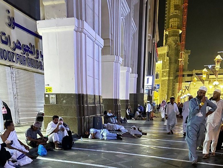 У входа в гостиницу отдыхают какие-то люди. Возможно, это нелегальные паломники. Живут они на время хаджа на улице. А устроились на ночлег у входа в отель потому что там работают кондиционеры. Никто их не трогает, не тревожит, не гоняет. Все понимают, что на улице, несмотря на то, что ночь, очень душно, температура воздуха около 40 градусов.