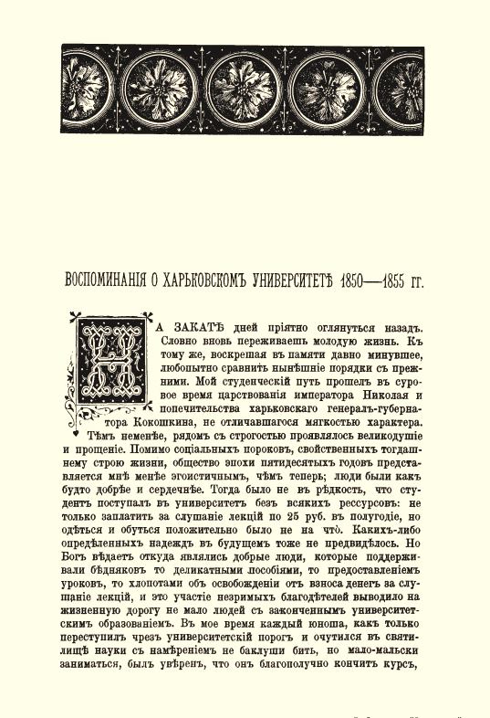 На закате дней приятно оглянуться назад. Словно вновь переживаешь молодую жизнь. К тому же, воскрешая в памяти давно минувшее, любопытно сравнить нынешние порядки с прежними. Мой студенческий путь прошёл в суровое время царствования императора Николая и попечительства Харьковского генерал-губернатора Кокошкина, не отличавшегося мягкостью характера, тем не менее, рядом со строгостью проявлялось великодушие и прощение. Помимо социальных пороков, свойственных тогдашнему строю жизни, общество эпохи пятидесятых годов представляется мне мене эгоистичным, чем теперь; люди были как будто добрее и сердечнее. Тогда было не в редкость, что студент поступал в университет без всяких ресурсов: не только заплатить за слушание лекций по 25 рублей в полугоде, но одеться и обуться, положительно было не на что. Каких-либо определённых надежд в будущем тоже не предвиделось. Но, Бог ведает, откуда являлись добрые люди, которые поддерживали бедняков то деликатными пособиями, то предоставлением уроков, то хлопотами об освобождении от взноса денег за слушание лекций, и это участие незримых благодетелей выводило на жизненную дорогу немало людей с законченным университетским образованием. В моё время каждый юноша, как только переступил чрез университетский порог и очутился в святилище науки с намерением не баклуши бить, но мало-мальски заниматься, был уверен, что он благополучно кончит курс, потому что опасных подводных камней в студенческом плавании не было. Мы знали, правда, что где-то там, на западе существуют другие будто бы лучшие порядки, чем у нас; но мечтать об них, а тем более стремиться к пересадке их на нашу почву никому в голову не приходило. В наше время все провинности студентов заключались в ношении длинных волос, не застёгнутом на все пуговицы мундире, посещении трактиров и подобных мелочах.