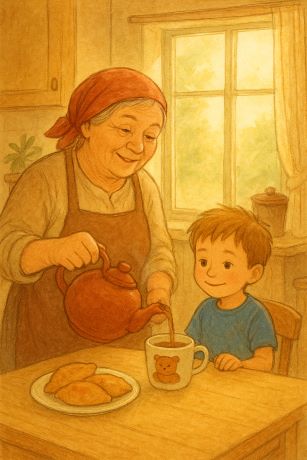 Вымытый и переодетый я стою в солнечной кухне и смотрю на стол, на котором стоит тарелка с любимыми пирожками и моя чашка с медвежонком на боку.
