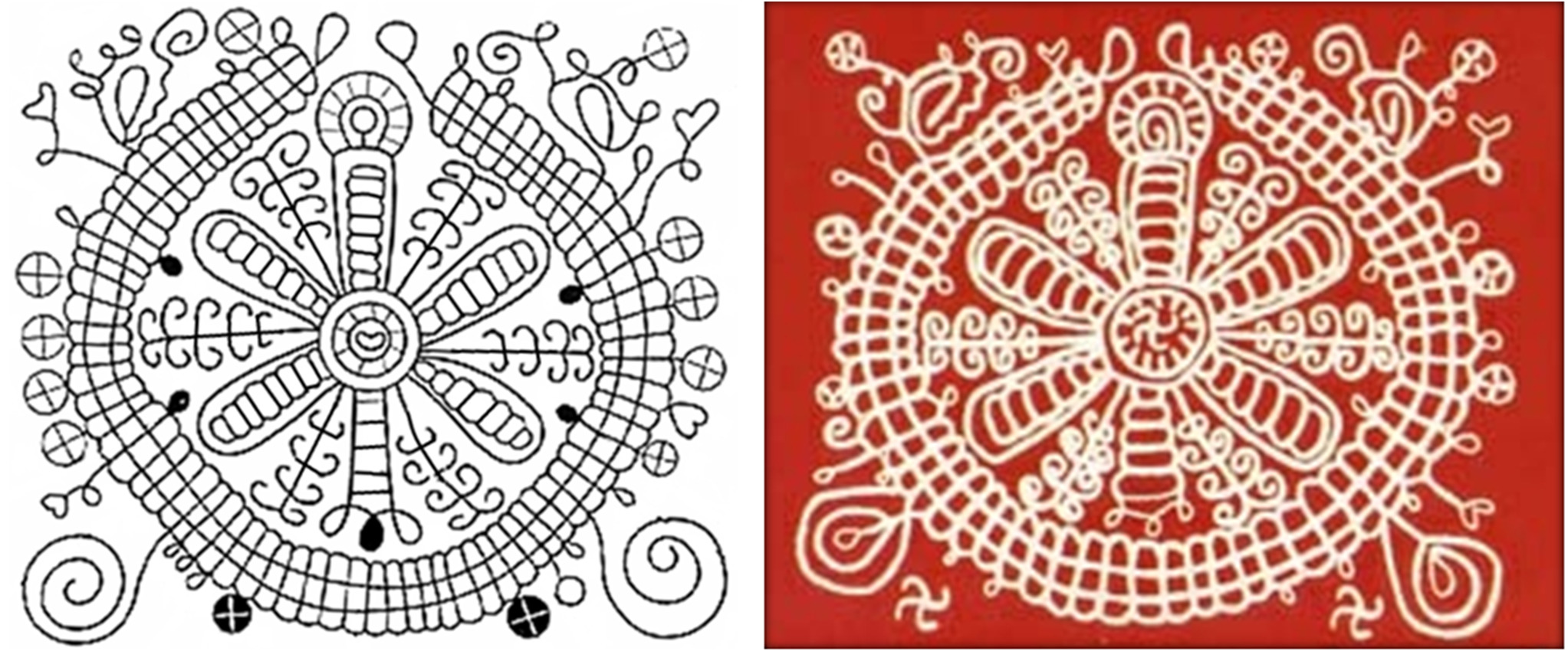 - с внешней стороны круга вышиты разные знаки: петельки, круги с вписанными в них крестами, спирали, сердечки/«кривулинки», ажуры