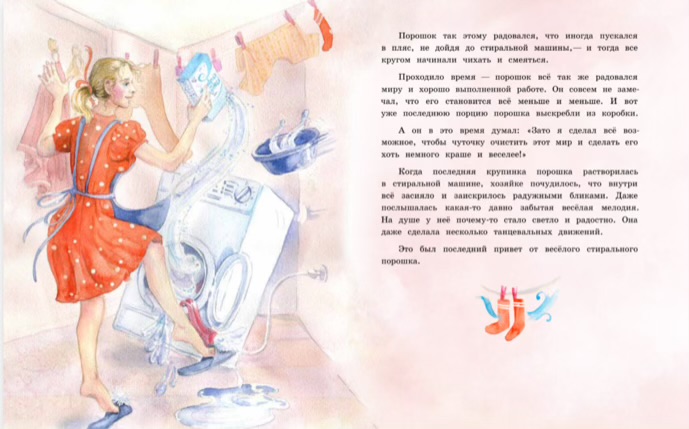 Порошок, неодушевленный предмет, наделен человеческими качествами. Эта сказка - о хорошем человеке, трудяге, честном, бесхитростном, самоотверженно трудившимся всю жизнь. От него шло только добро и никому никогда он не сделал плохого. И даже память о нем - была окрашена в светлые тона. Такие люди делают мир чище, лучше и когда они исчезают с концами - их потом долго-долго не хватает тем, кто их знал.