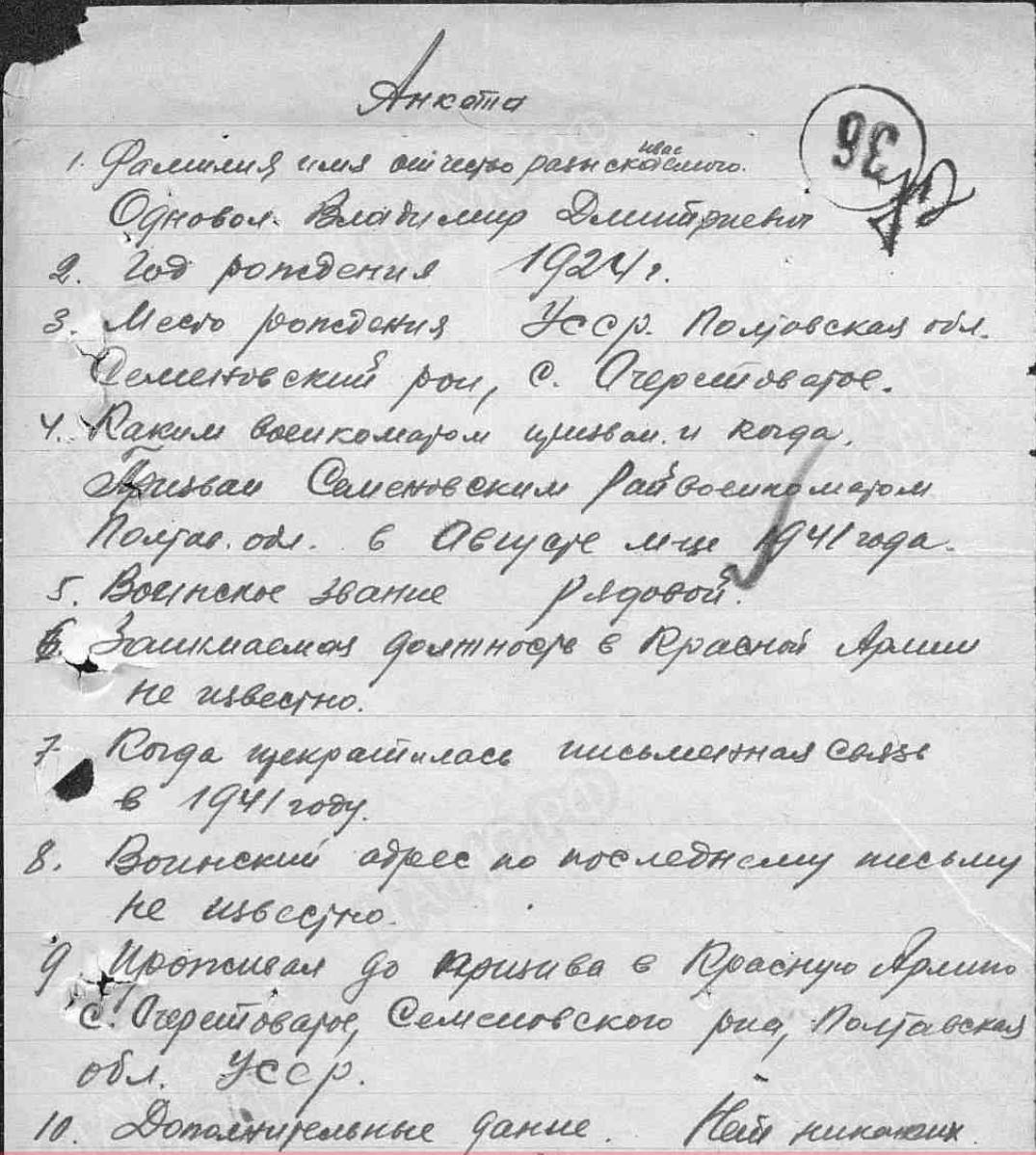 Такая же фамилия встретилась мне в архивном перечне подразделения Мухоморова при Полтавском тракторном училище: под номером 194 записан ОДНОВАЛ Владимир Дмитриевич. Ранее не служил.