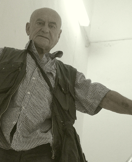 Художник Феликс Бух спускается из своей Мастерской в парадном, — фото: Артём Киракосов, 03 08 2024, Мастерская Художника Феликса Буха (Москва, ул. Таганская 31 \ 22)