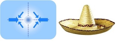Тогда уменьшившееся вследствие коллапса давление в окрестностях корпускулы может, тем не менее, быть достаточным для её удержания, а внешнее давление эфирной среды может компенсироваться тангенциальными напряжениями, как показано на рисунке. График плотности эфира построенный над плоскостью с частицей будет напоминать шляпу сомбреро с загнутыми полями. См. рис. внизу.