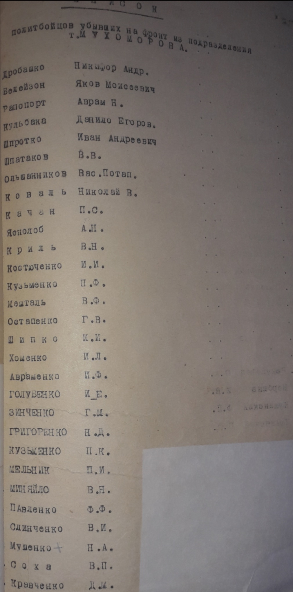 Другой, вспомогательный - "Список политбойцов, убывших на фронт из подразделения Мухоморова", на две сотни фамилий - наоборот, начинается с подробностей.