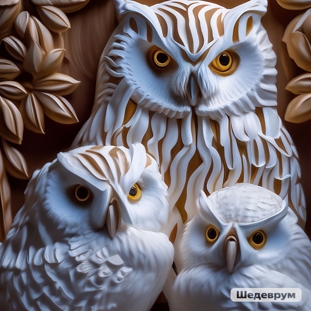 Иллюстрация: Полярная сова с птенцами в технике маркетри. Сайт Шедеврум