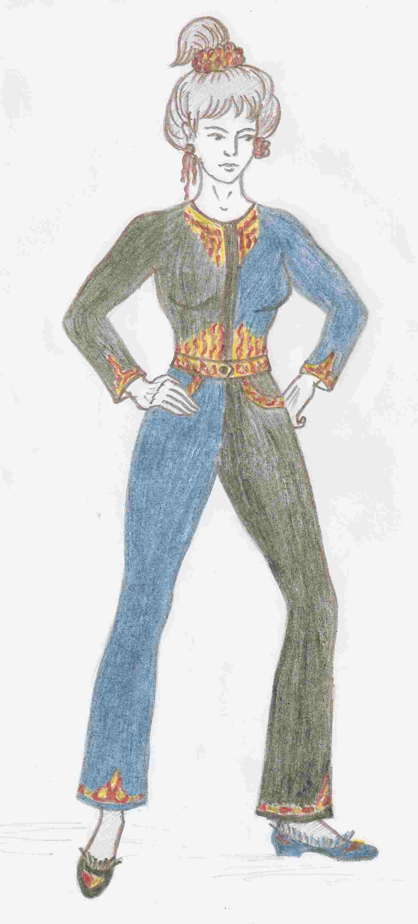 Двухцветные джинсовые брюки, разделённые по цвету пополам по вертикали: одна половина синяя, вторая – чёрная и наоборот относительно куртки. Под синей половиной куртки чёрная половина джинсов, под чёрной – синяя.