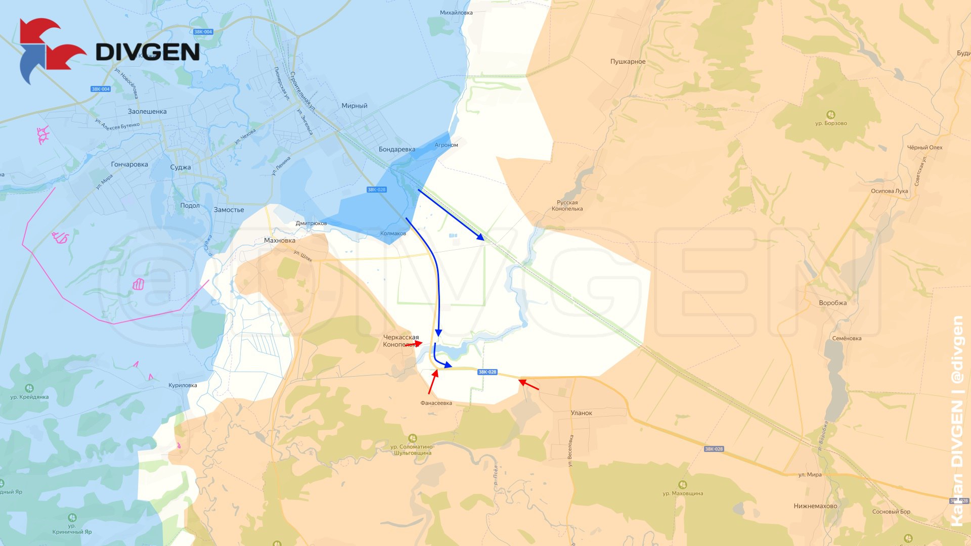 Теперь о последнем контрнахрюке. Сегодня утром часов в 10-00 по Москве ВСУ силами до 1 БТГ (40 единиц бронетехники и 400 чел. ЛС) попытались прорваться от Бондаревки на Уланок в Суцдженском районе Курской области. Первая колона: 3 танка 1 БРЭМ натовского типа на основе танка «Абрамс» и до 6 БМП «Бредли» и до 12 ББМ разного производства прошли строем колонной до перекрестка дороги 38К-028 и проселочной, поворачивающей на Фанасеевку и были сожжены в основном дронами и немножко артой. К 16-00 по Москве от этой колоны остались только горелки и трупы. Это севернее примерно в полукилометре от Черкасской Конопольки, в которую они так и не зашли.