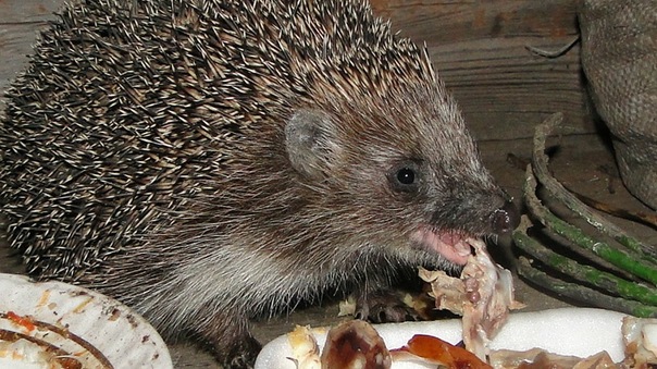 Мы собрали остатки от шашлыка и решили предложить ежу. Он не робел, подошел ближе вразвалку, но уверенно, чуть пофыркивая при этом. Мы с дочкой положили перед ним угощение. Сначала ежик свернулся в клубок от нашего приближения, но чувствуя, что мы не собираемся его обидеть, вытянул вперед длинный черный носик, посмотрел угольными глазками, понюхал курочку и одобрил.