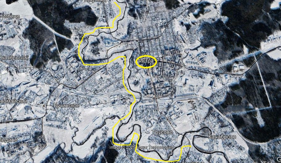 Действительно, река Истра в этом месте "рисует" гигантское "земноводное", наподобие крокодила. "Лапа" этого земного "чудовища" видимо было почитаемым местом у русских, так как церковь здесь поставила Воскресенский Новоиерусалимский монастырь.