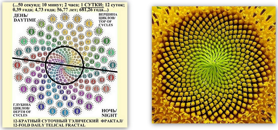 Thus, the 12-fold progression of the daily cycle is a series in which each previous time interval is a structural unit for a larger time cycle represented by a subsequent interval. In fact, we are looking at a progression of cycles, not time segments, each of which consists of 12 parts and is 12 times larger than the previous cycle. This progression can be considered as a fractal – time structural building with a fractional metric dimension - see the picture.