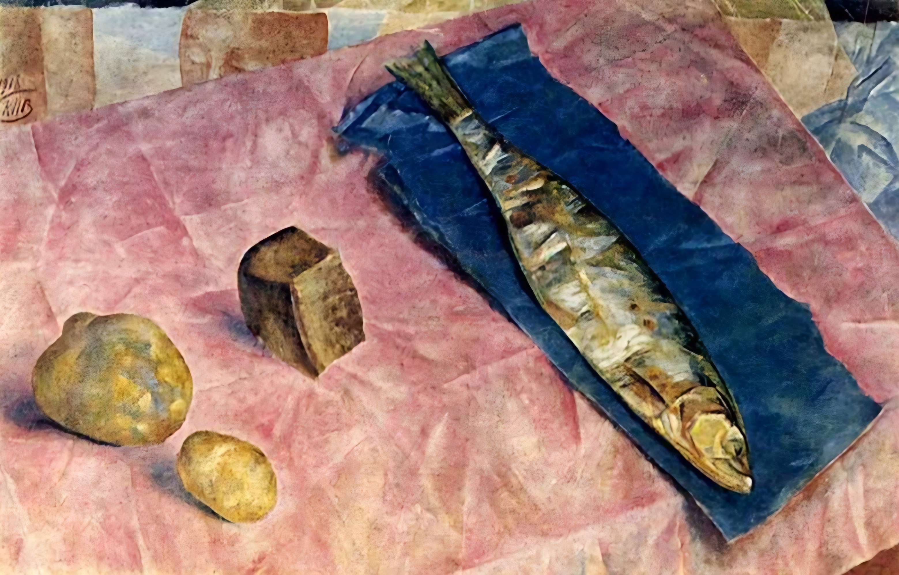 И всё же для меня самым поражающим натюрмортом с едой является картина Петрова-Водкина "Натюрморт с селёдкой". Натюрморт был создан в те годы, когда большинство людей питались плохо . Художник написал простые, самые доступные продукты. Главным элементом картины является селёдка.