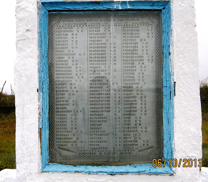 Плита с фамилиями погибших в Макарьевке Жамбылского(Пресновского) района СКО, фото автора, 2013 год. На 2025 год не существует.