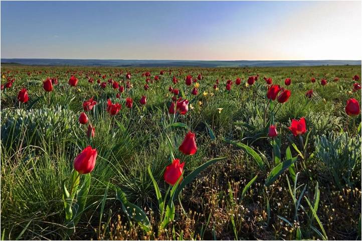 Скоро в степи можно будет наблюдать великолепное и трудно передаваемое словами явление – цветение тюльпанов. Алые, желтые, белые цветы пестрой лентой тянутся до самого горизонта, и мало что может сравниться с этим чудом природы по своей красоте.