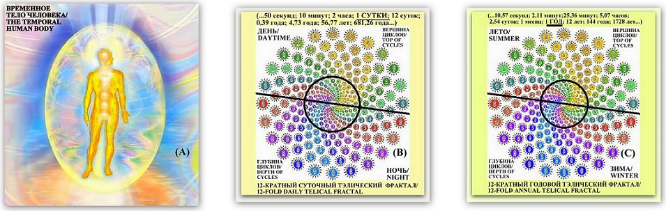 You will be interested to know that in the brilliant science of the «aliens» - Telia, used by them in all spaces, each cycle and hypercycle is divided into 6/12/24 equal parts, each of which has its own descriptive and practical properties. And for the life of earthlings, the cycles of the Earth's daily and annual rotation are most important. Therefore, to describe the temporal human body (A), 12-fold derivatives of the Earth's rotation cycles (around its axis – (B) and around the Sun (C)) are considered. The current state, as well as the temporal health and success of an earthly person and earthly communities, depend on these two cycles and their derivatives, and not on the stars and not on the movement of other planets and asteroids of the Solar system, as it is partly «scientifically» described by astrology.