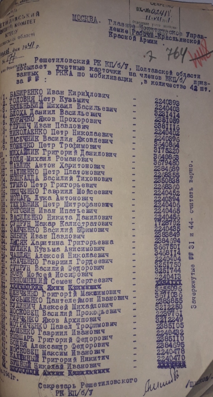 Чертова дюжина коммунистов - чем не БРАТИЯ?! - в томе, хранящемся в архивах ГПУ, в двух списках Решетиловского райкома ВКП(б) (один из них, датированный началом июля 1941 года, перед заголовком):