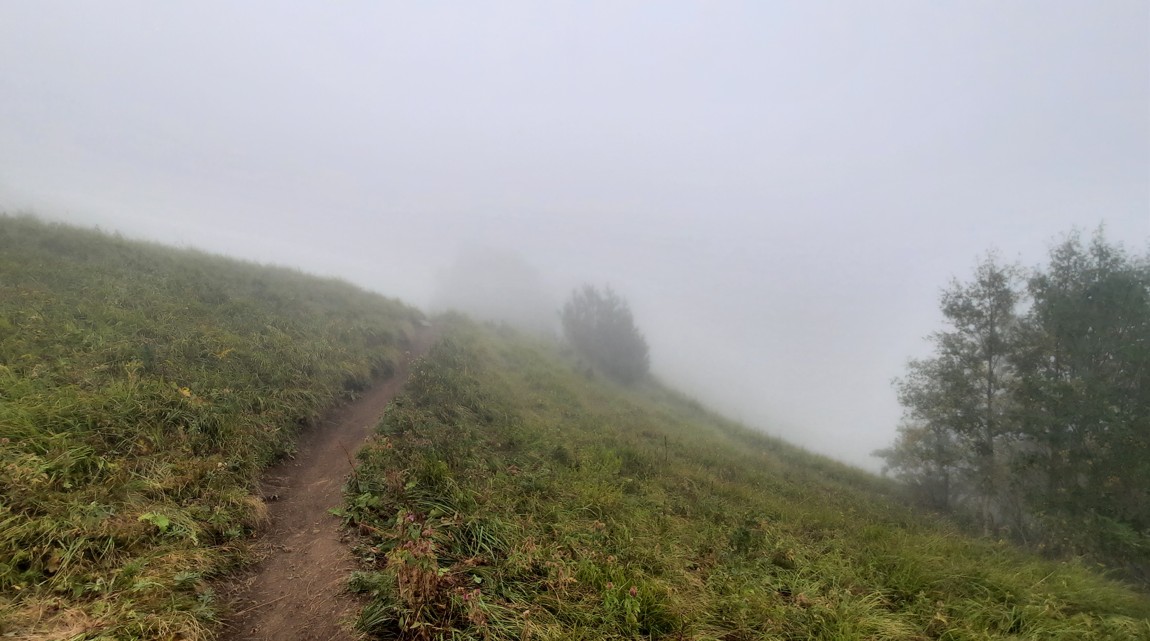 Я захотел записать мысли в блокнот и обнаружил потерю ручки. Решил идти за ней. Впервые за все время похода включили рации на случай, если заблужусь в тумане. Я оставил рюкзак, Егора и пошел по тропинке сквозь туман обратно на поляну. Рационально причин волноваться мало. Но я все же один в горах. На мне маленькая поясная сумка с экстренным набором вещей и вообще нет воды.