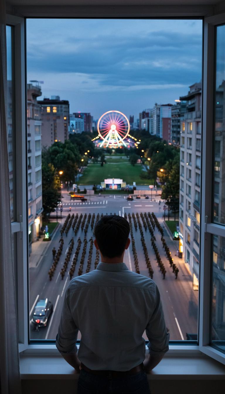 Все четыре окна моей квартиры выходили на городской парк. Вид был прекрасный: цветастое колесо обозрения, наполовину утонувшее в зелени парка, чуть дальше - речка, за ней - почти невидимый частный сектор, и еще дальше - круглое, как блин, или лысина вождя, поле. Этот день мы с женой решили посвятить мытью окон. Мы и не предполагали, что на это уйдет практически весь день. И уж тем более, что в течении всего этого времени нам придется слушать военные марши. Бесконечное количество маршей. Они начали звучать в десять утра, и длилось это до десяти вечера. Может, до девяти, но к этому времени точное время уже не имело никакого значения.