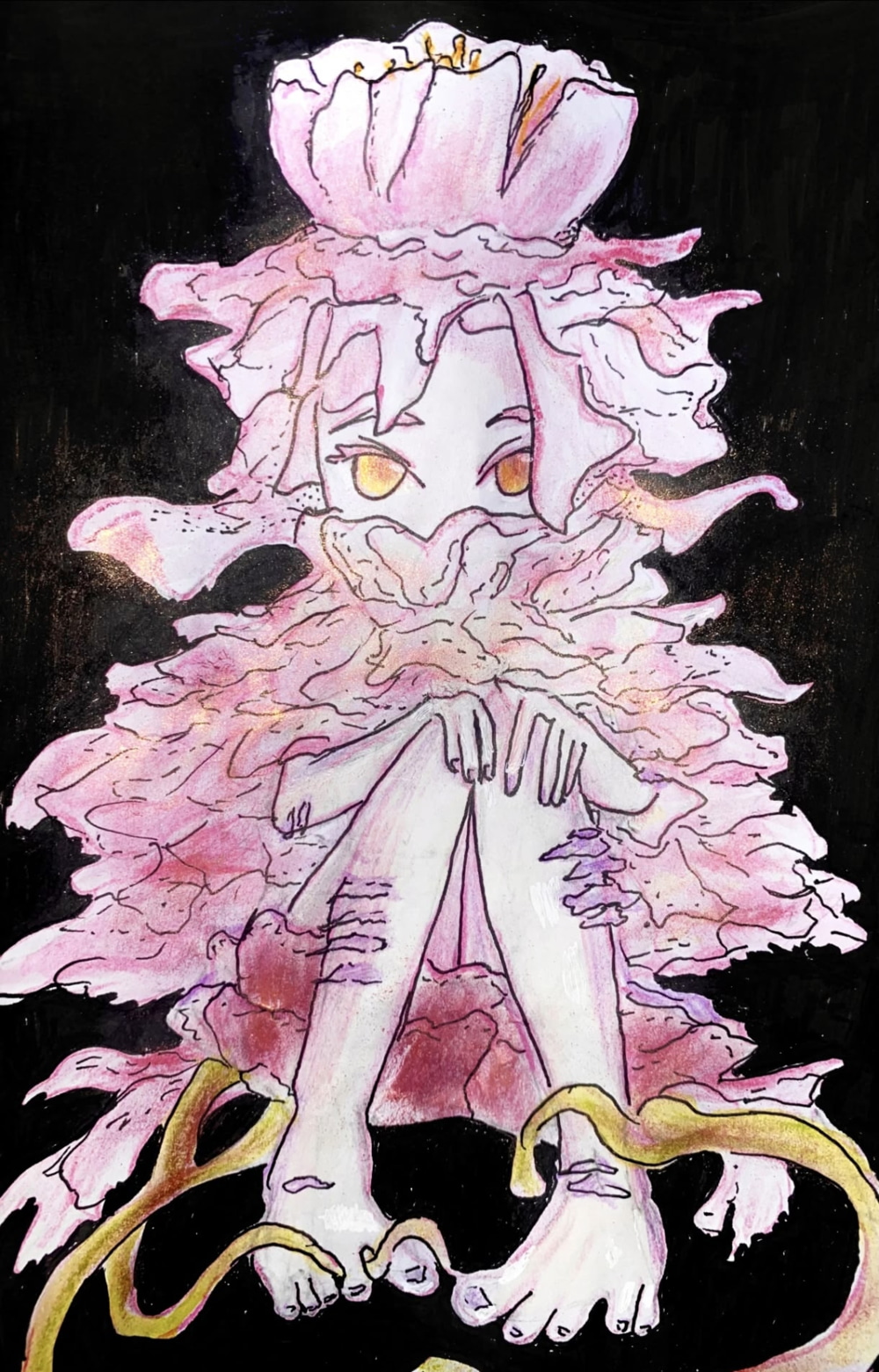 Пан`Тюль, укрытая грязным плащом, подобралась поближе, чтобы рассмотреть существо внимательнее. Пыльные, когда-то бывшие белыми лепестки и их форма привели её к выводу, что это могла быть пион. Но поверх обычного соцветия на голове существа прямо по центру цвёл ещё один бутон, уже ярко розовый. И гораздо более свежий, чем родные лепестки существа. Словно нелепо приклеенный, для Пан`Тюль он выглядел как третья рука.