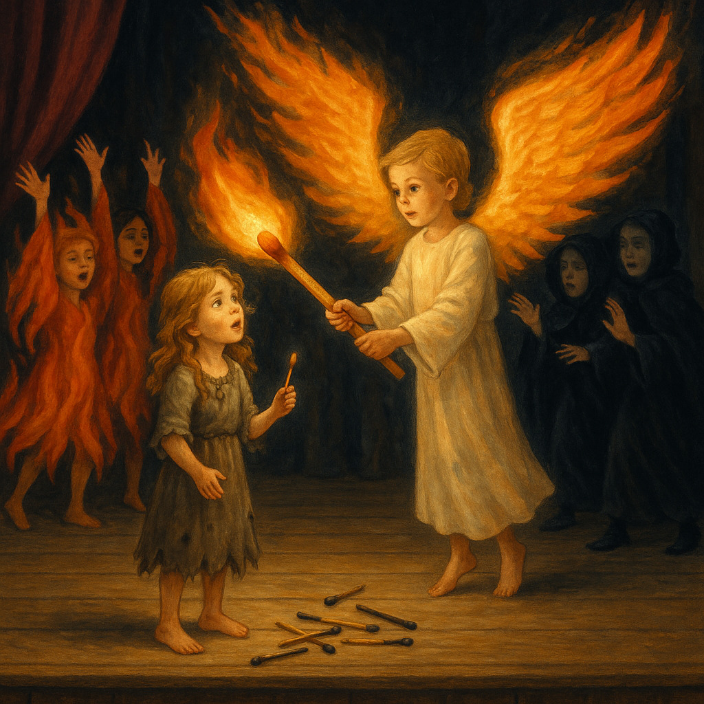Затихла музыка, завяли прожекторы. И тут появился наш добрый ангел, Игорь. В эту минуту, заслоняемая тьмою, я незаметно и ловко стянула с себя широкую мешковину. И теперь я предстала в белоснежном платье, с ангельскими крыльями за спиной. Когда Игорь с диадемой на голове приблизился, протянув мне обе руки, я вдруг отчетливо услышала в голове его бурчанье: «А что сразу я?» Я едва смогла сдержать смех, но вот улыбка пришлась как нельзя кстати. И эта улыбка, как и слезы, была настоящей и искренней. Вот оказывается какую хорошую роль играют вовремя поднятые воспоминания. Мы с Игорем протанцевали нашу ангельскую партию, а массовка превратилась в небесных духов. Игорь указал рукой на зрителя, как бы говоря, что теперь как добрый ангел, я должна хранить людей от зла. Игорь вложил в мои руки длинный тонкий фонарь, похожий на большую спичку. И я с самым светлым выражением лица приблизилась к краю сцену, протягивая людям огонек тепла и света. Свет в зале приглушался, и оставив в видимости лишь меня и мою большую спичку. Музыка завершила полет, и недавно парящее пробуждение тихо угасло на сцене, как последняя спичка.