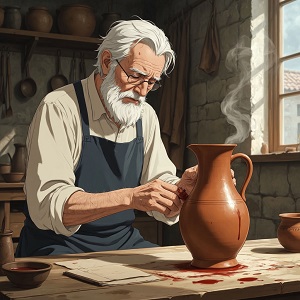 Всю ночь, гончар делал печь, собирал сучья для огня и таскал воду из родника для глины. Не замечая времени, он трудился и наконец, радостный момент – всё готово для того, чтобы начать лепить. Однако, вспомнил гончар, что оставил лопатку для добычи глины в большом городе: «Что же делать?» - подумал гончар, времени было мало, чтобы искать продавца лопат. Без раздумий, гончар начал выкапывать глину руками и вдруг, что-то острое пронзило его руку - это был острый осколок слюды, который отколовшись от скалы, упал в глину.