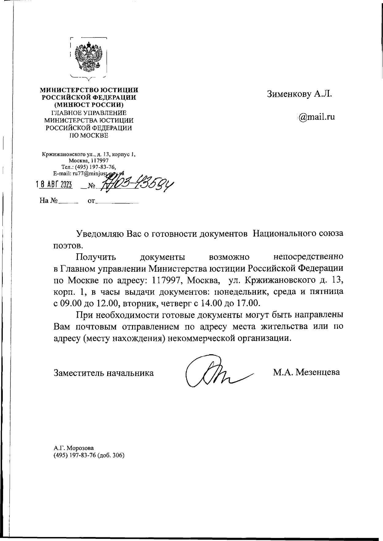 Я профинансировал все этапы подготовительной и организационной работы создания новой организации, и в августе 2023 года получил извещение, пришедшее на мой имя, от Заместителя начальника Главного управления Министерства юстиции Российской Федерации по Москве (см. фото), уведомлявшего меня, о готовности документов Национального союза поэтов.