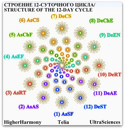 2) In the structure of any cycle, the 12 components of its fractions are abbreviated as follows: 1 - AsSF; 2 - AsAS; 3 - AsRT; 4 - AsEF; 5 - AsChF; 6 - AsCS; 7 - DeCS; 8 - DeChE; 9 - DeEN; 10 - DeRT; 11 - DeAE; 12 – DeST. Where S is the Sapphire function, A is the Amethyst function, R is the Ruby function, E is the Emerald function, Ch is the Chrysolite function, C is the Citrine function, As is the Ascending half of the cycle, De is the Descending half of the cycle.