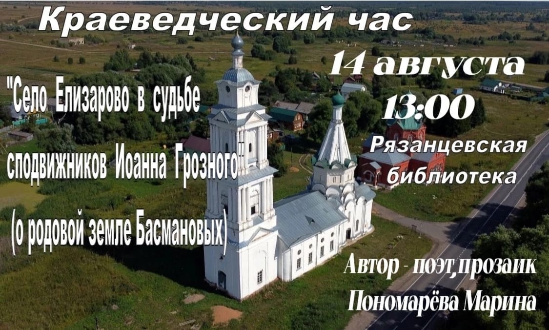 14 августа в 13:00 в Рязанцевской библиотеке (рядышком с Елизарово) пройдет краеведческий час, посвященный Басмановым.