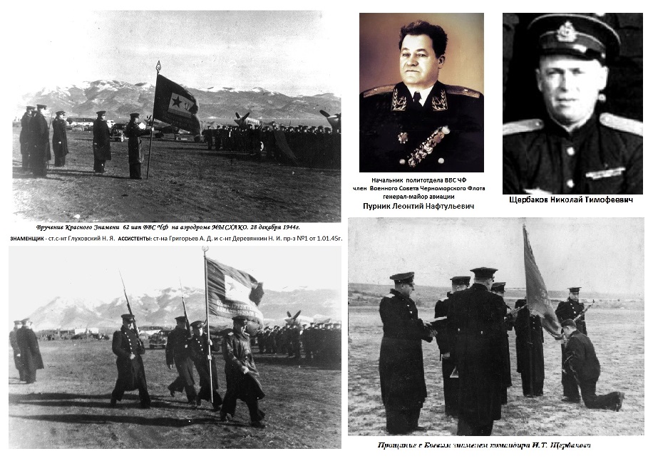 "28 декабря 1944г. 62 ИАП ВВС ЧФ в соответствии с Указом Верховного Совета Союза ССР от 5 февраля 1944 года и приказом НК ВМФ №50 от 8 февраля 1944г. Представителем Военного Совета ЧФ генерал-майором авиации Пурник было вручено Красное Знамя.