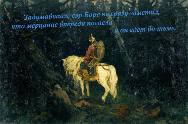 Поскольку быстро темнело, Господь послал Борсу сияющее облачко, указывающее путь, чтоб он не заблудился в Диком лесу. Ночью облачко превратилось в мерцающий огонёк – бледным мотыльком он порхал среди веток и листвы, отводя наездника от ям и препятствий. Теплое его свечение озаряло даже удаленные предметы, и конь привык следовать в нужном направлении, не требуя поправок от пребывающего в молитве ездока. В сей дивной обстановке измученное в испытаниях сердце Борса согрелось надеждой ожидавшего впереди, и он дал себе волю отвлечься. Вскоре странствия его завершатся, он сможет наконец вернуться в Камелот, насладиться покоем и поведать рыцарям Круглого стола о случившихся с ним приключениях. Радость короля Артура о долгожданном обретении священной реликвии будет для него высшей наградой.
