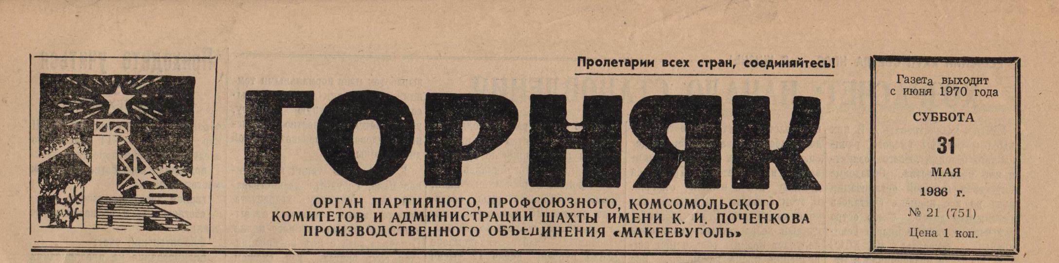 Опубликовано в газете "Горняк" №21 (751) (г. Макеевка, 31 мая 1986 г.)