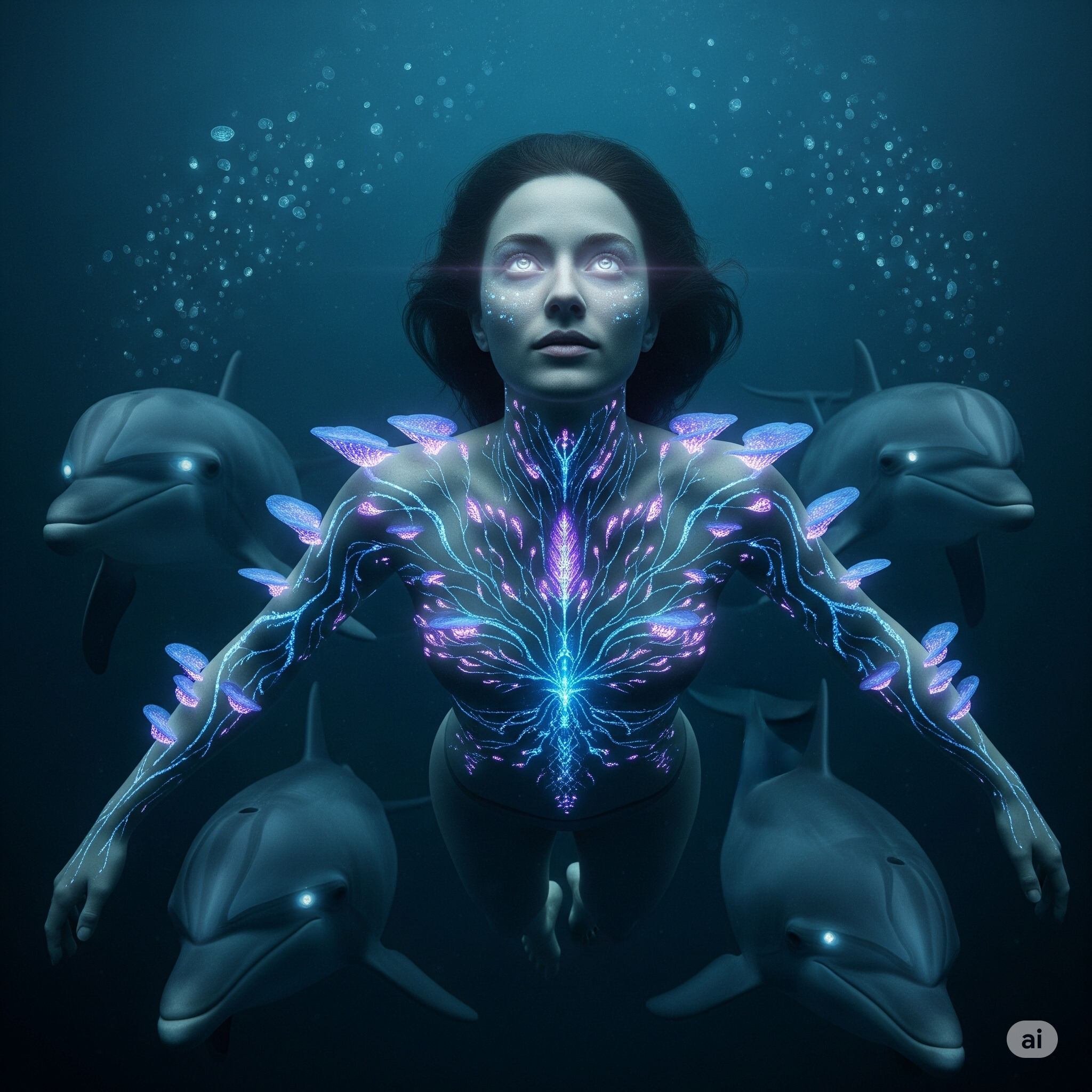 Один из дельфинов всплывает в луче прожектора. Его внезапно почти прозрачная кожа изнутри светится белыми прожилками, будто в ней течёт не кровь, а сплетения грибницы. Глаза мутные, и всё же — наполненные знанием, которого человеку знать не положено.