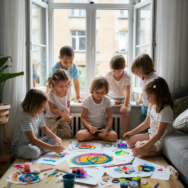 В маленькой комнате на окне — дети. На столе — коробки с цветной бумагой, пуговицами, клейкой лентой, обрезками ткани и ленточками, которые родители принесли после работы. Это всё — уже сотворённое: куски света, собранные в вещи. Дети берут их, рвут, приклеивают, придумывают крылья и хвосты, домики и звёзды. Их поделки — не из пустоты; они собирают мир, который дал им родитель, сосед, дядя в магазине и само небо.