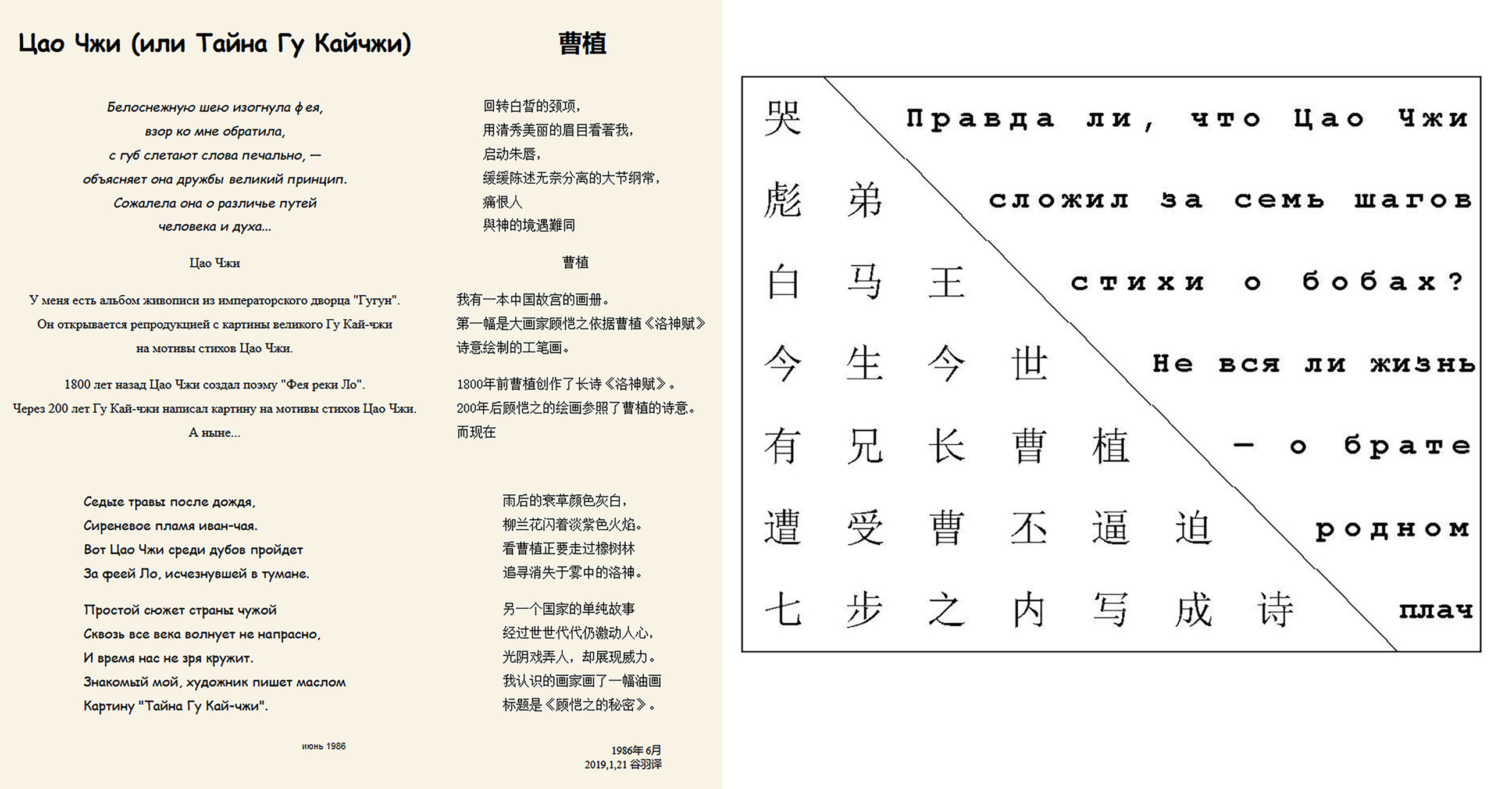 Гу Юй послал мне своё эссе о Цао Чжи (о разных переводах его стихотворения «Стихи за семь шагов») и предложил написать новое стихотворение о Цао Чжи и его брате Цао Пи.