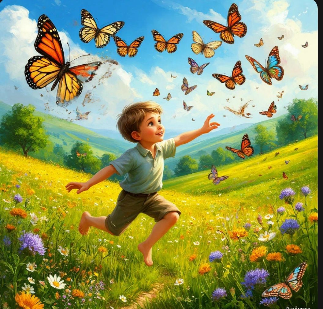 Каждое утро Лёва выбегал в поле и гонялся за ними. Он протягивал руки, стараясь поймать хоть одну, самую красивую. Но стоило ему подбежать, как бабочки в испуге взмывали вверх и улетали прочь. Лёва возвращался домой грустный, с пустыми руками и тяжёлым сердцем.