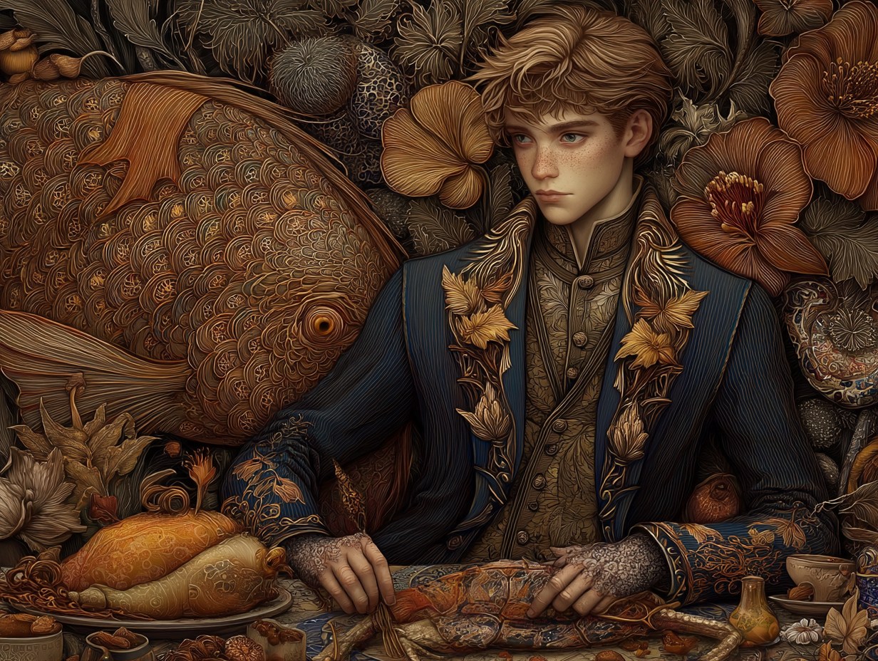 Хитрый осетр прятался от острых трезубцев-вилок за баклажанными волнами,