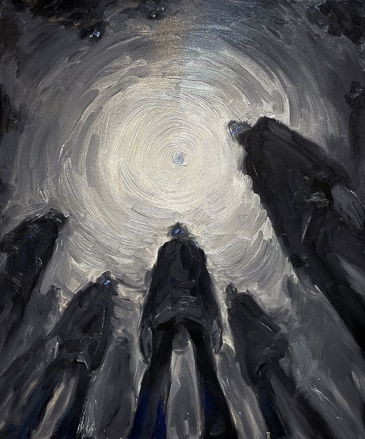 Перед ним стояли люди... или не люди? Фигуры, сотканные из теней и мрака, высились над ним, загораживая остатки света. Он не мог разглядеть их лиц. Они словно стирались, расплывались в темноте, оставляя лишь ощущение присутствия – давящего, всепроникающего, чуждого. У него было ощущение, что они смотрят на него, хотя он не видел глаз. Это было какое-то иное зрение, необъяснимое, проникающее сквозь кожу, кости, саму душу.