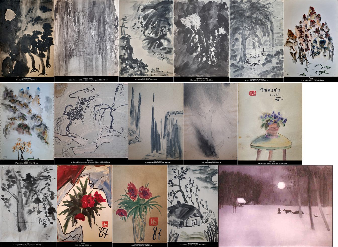 Эти точки разной величины вместо листьев у дерева слева я взял с китайских картин. Эти кружочки вверху ствола ивы справа, из которых растут ветви, я взял с китайских картин. Земли нет, только будто два острова, на которых два дерева плывут в море. В водовороте, времевороте. Эта картина нарисована дома у Вити Николаева в Лианозове, когда сидишь на полу, малюешь гуашью или темперой, и нужно рисовать спонтанные абстракции. Но китайские спонтанные абстракции всегда оказываются деревьями, травами, камнями и каллиграфическим текстом. Геометрический абстракционизм китайцам чужд, у них и деревья должны изгибаться-извиваться подобно драконам, и камни чем причудливее, чуднее, кривее, тем лучше. А на этой картине тушь — что-то вроде текста, текста того диалога, который и дал картине название. А вся живопись — в фоне, гуашевом или темперном. Если бы тушь была на белой бумаге или шёлке или холсте, неважно, на чём, главное что белом, картины бы не было. Ну, и, конечно, цвет фона. Это цвет сумрака, а сумрак — другое название хаоса, а хаос — другое название перехода от небытия к бытию. Или обратно, если время считать кругом, снимающим проблему обратимости времени. Теория струн появилась в 60-х, но серьёзно за неё взялись в 84-86-м, т.е. тогда же, когда появилась эта картина, на которой можно рассмотреть струны.