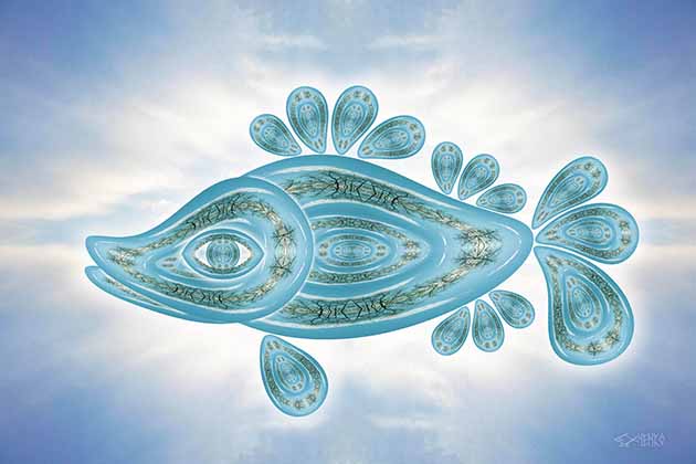 Сказочная рыба лазурного неба плывёт в небесном сиянии. Рыба особо почитаема в любовной и Божественной символике. Можно сказать, что Божественная Любовь предстала в лазурном свете.