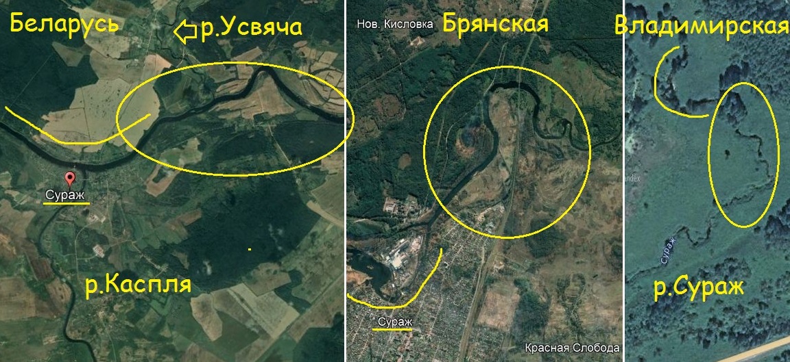 Кроме поселений, есть и река Сураж во Владимирской области, которая также имеет устьевое название по форме "лица" и "живота" старшей реки, куда Сураж впадает.