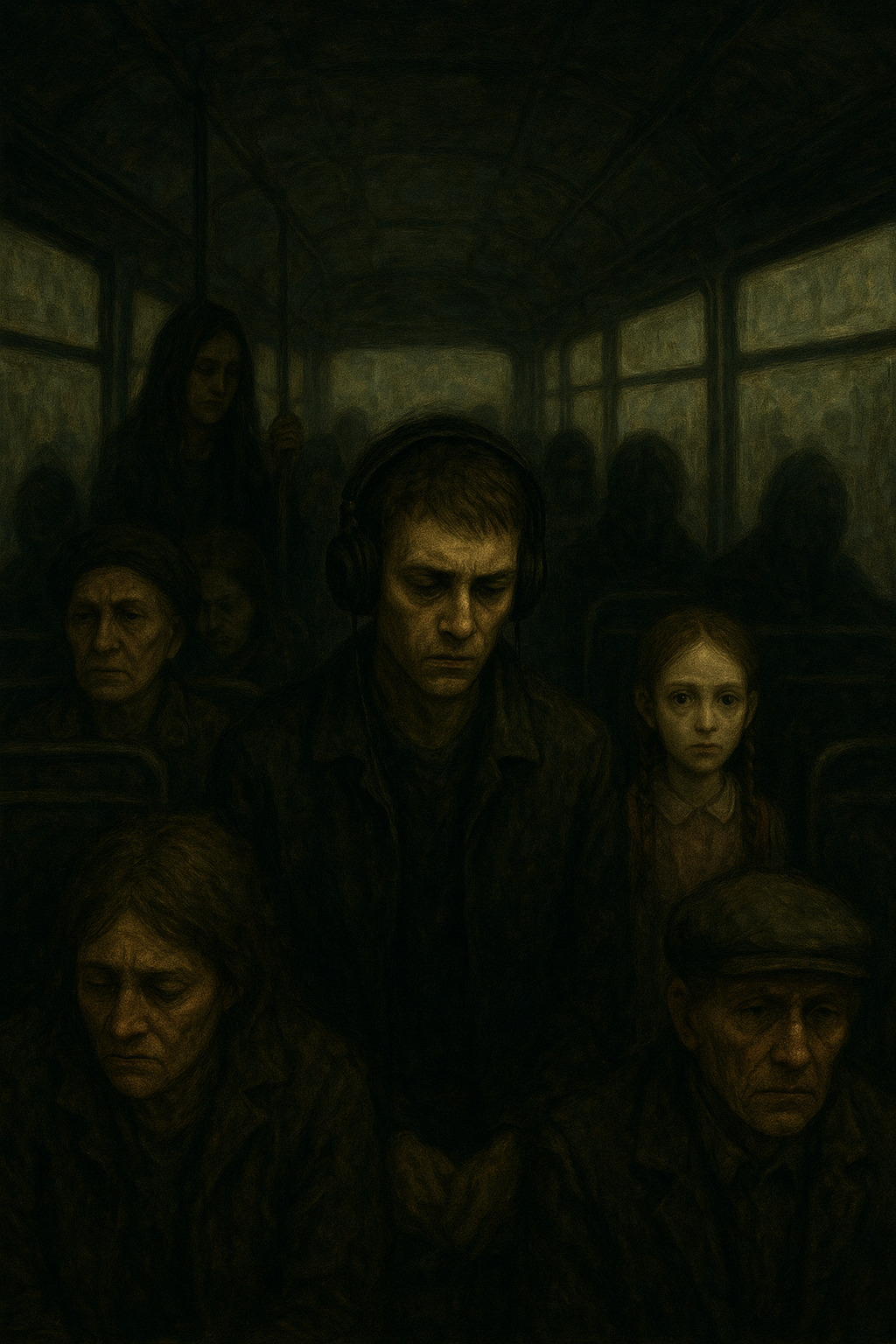 Предисловие от автора: Я хотел показать, как привычное (автобус, дорога, усталые пассажиры) может внезапно обернуться чем-то иным. Местом перехода, порталом, символом. Нам кажется, что мир ясен и предсказуем, но стоит лишь приглядеться, и обыденное наполняется скрытой мистикой, становится зеркалом того, чего мы обычно боимся увидеть.