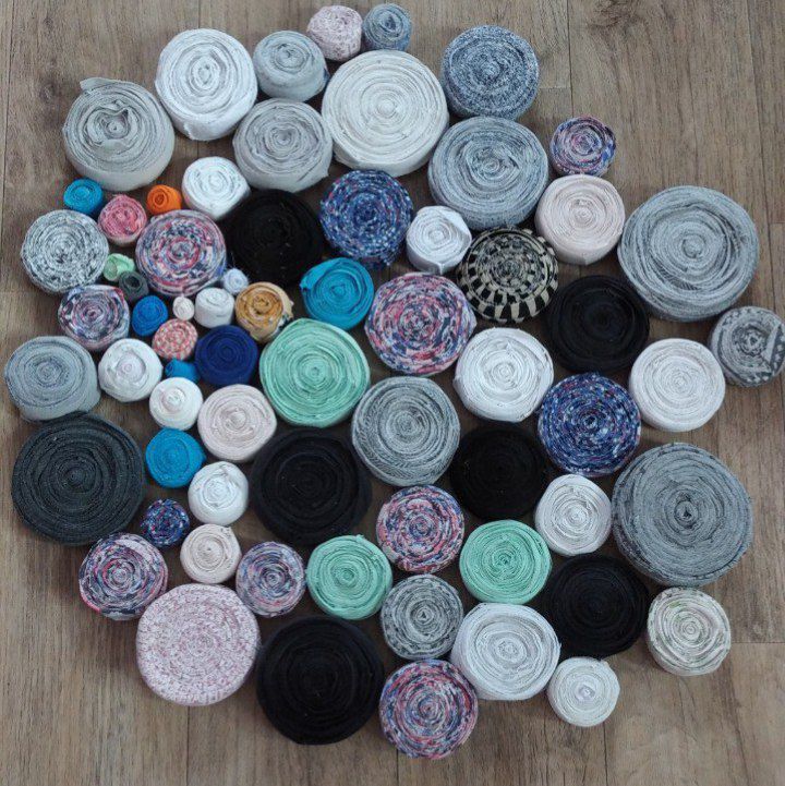Прошло несколько десятков лет, я усовершенствовала навыки, научилась делать из ткани уже не клубочки, а свои, авторские, как я их нежно называю, «улиточки» - большое их количество аккуратно разложено по контейнер. Я ими не просто вяжу, а как художник, творю, подбирая палитру.