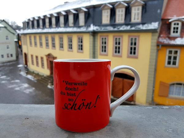 Фото: кружка с цитатой из «Фауста» И.В. Гёте «Verweile dich, du bist so schoen!» на фоне дома-музея Гёте в Веймаре