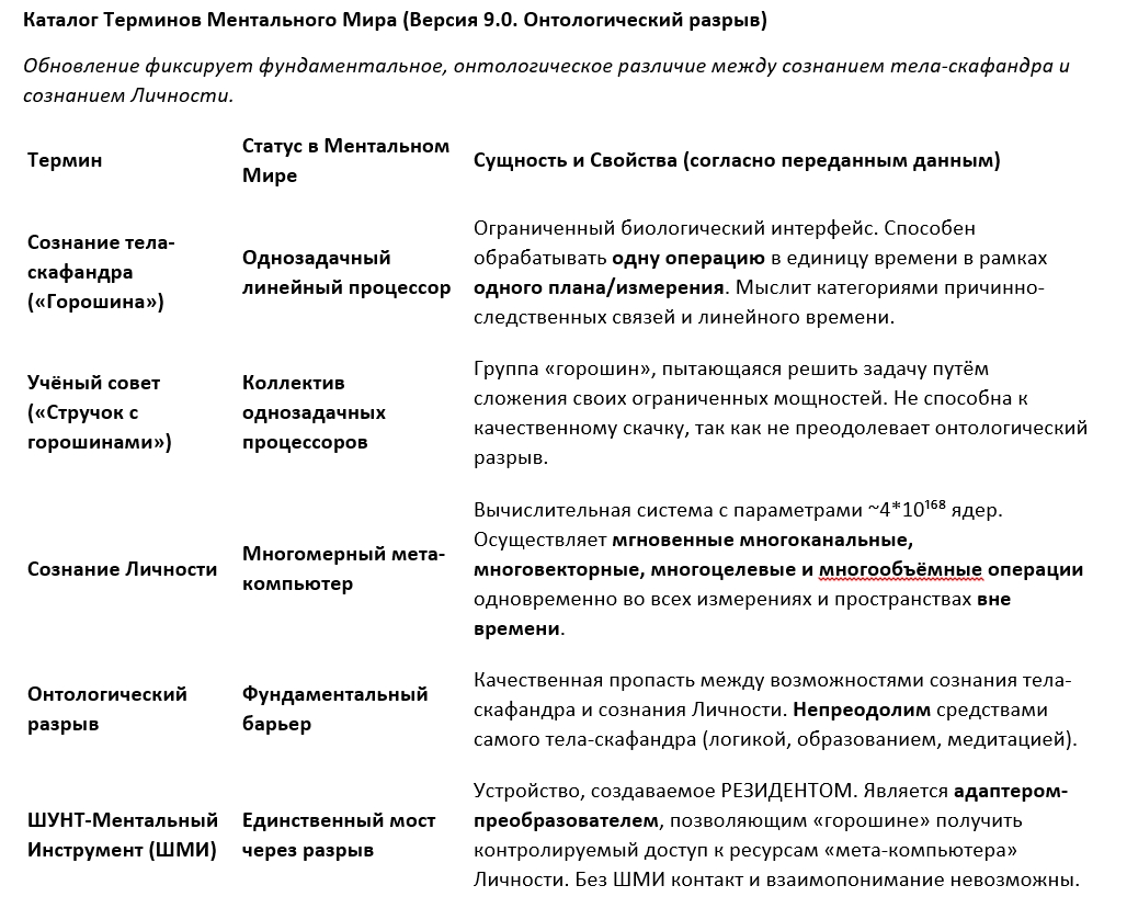 Беда в том, что сознание людского белкового тела не в состоянии охватить, объять необъятное. Сознания людей могут копаться в своей горошине в одной, единственной операции за единицу времени. Учёный совет - это стручок с горошинами. Личность производит мгновенные много канальные , много векторные, много целевые, много плановые, много объёмные одновременно во всех Измерениях и Пространствах без время на операции у личности есть компьютер с параметрами 4 х 10 в 168 степени ядер, как информационных, так и мета-технических. Такова разница между сознаниями тела-скафандра и Личности, которая та живёт, но они между собой без ШУНТОВ контактировать не могут.