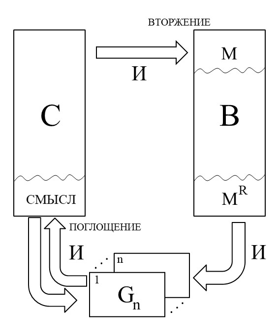 e) Процесс поглощения Сознанием (Absorption в терминологии T.Froese [25]) некоторого смысла из Материи МR, а точнее – из результатов сопоставления элементов М и МR. Здесь будет уместным указать, что все описанные выше процессы a) – e) достаточно естественно реализуются в так называемой мэонической концепции Мироздания (maeon по-гречески означает отсутствие бытия, ничто), предложенной профессором МГУ, доктором физико-математических наук Л.В. Лесковым [33].