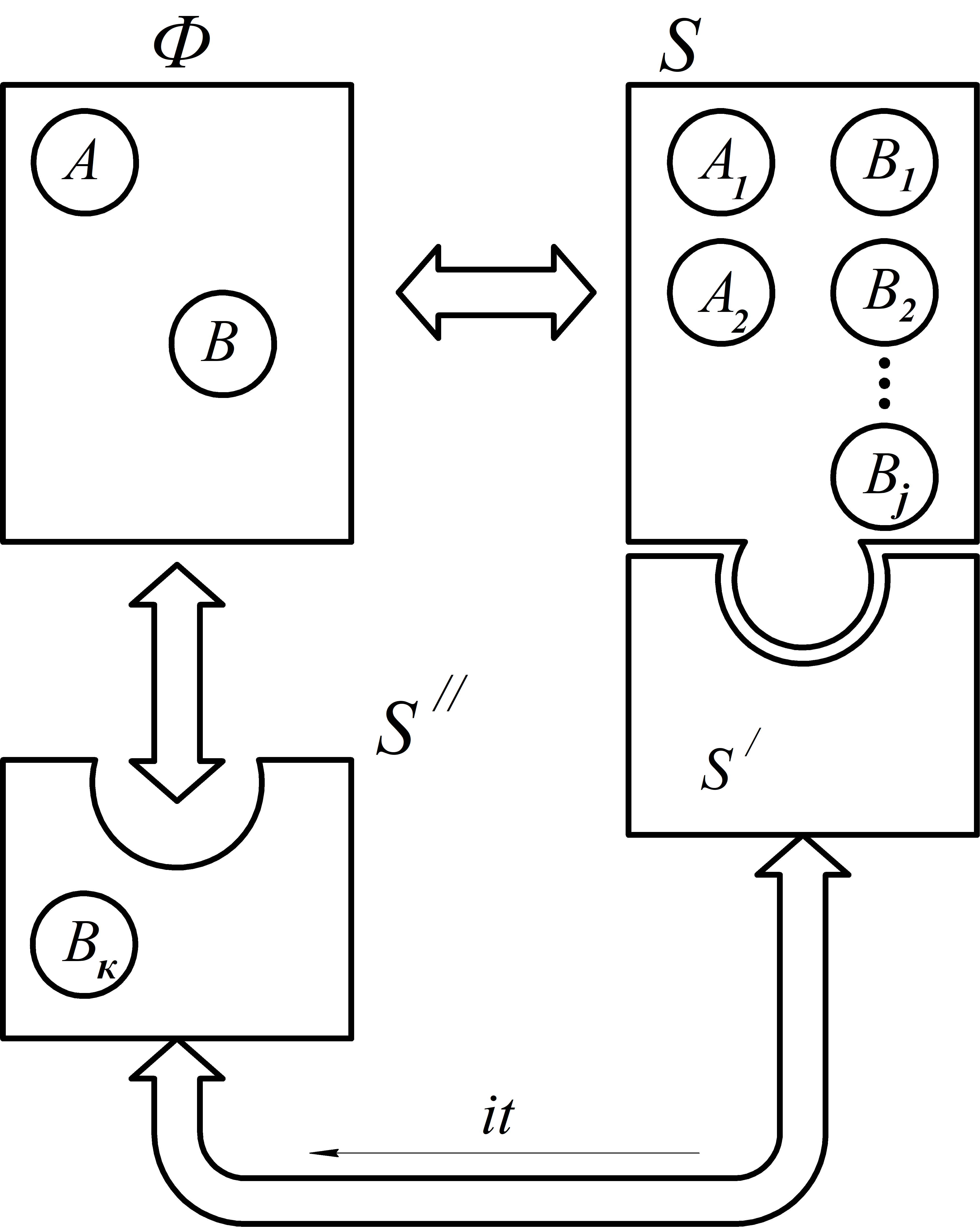 На рисунке 1 приняты обозначения, аналогичные тем, которые использованы в работе [6, с. 144 - 147]. Существует нечто, называемое материальной Природой S, которая существует объективно, то есть независимо от Сознания людей, и которая отображается волновой функцией ;, эволюция которой описывается уравнением Шредингера. Существует также субъект Ф, наделенный индивидуальным Сознанием, которое содержит некоторое намерение А, которое должно воплотиться в материальной Природе. В главе со знаковым названием «Модель квантового рождения физической реальности» Александр Гуц называет это намерение А «идеей» или «фантазией» [26, с. 148], но это не меняет существа дела.